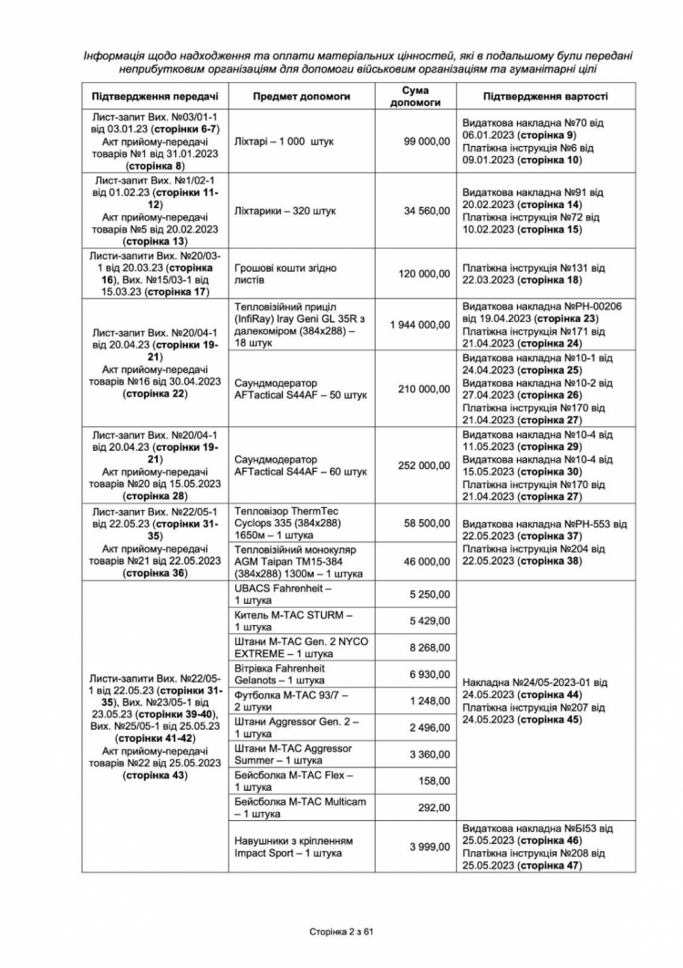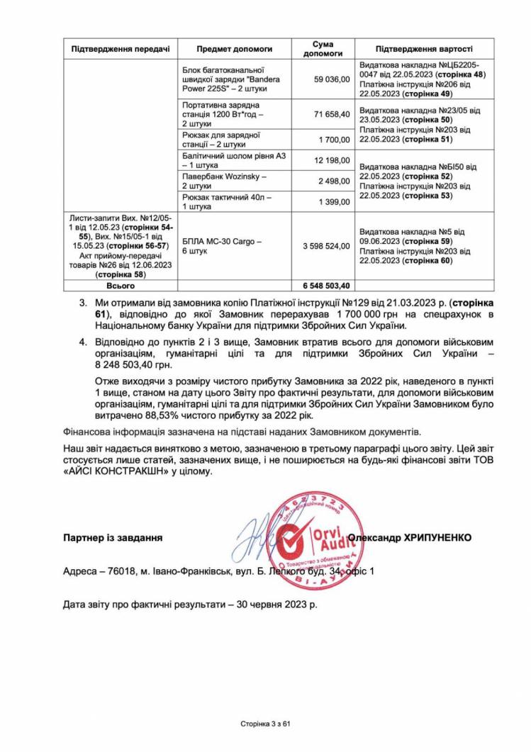 В первой половине 2023 г. со счета IC Construction было направлено 8 248 503,40 грн в поддержку Вооруженных Сил Украины, приобретение 18 тепловизионных прицелов и 110 глушителей для ГУР и на приобретение шести дронов для ССО. Для военных подразделений были приобретены зарядные станции, тепловизоры, другое оборудование и амуниция. Это подтверждено первичными документами о поступлении и оплате материальных ценностей.
