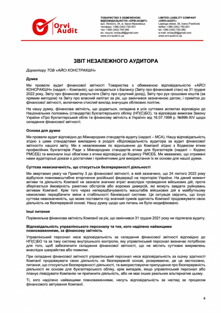 Украинская девелоперская компания IC Construction, являющаяся партнером отечественных и европейских благотворительных фондов, получила аудиторское заключение и аудиторский Отчет о фактических результатах использования доходов для помощи военным организациям, гуманитарных целях и поддержки Вооруженных Сил Украины