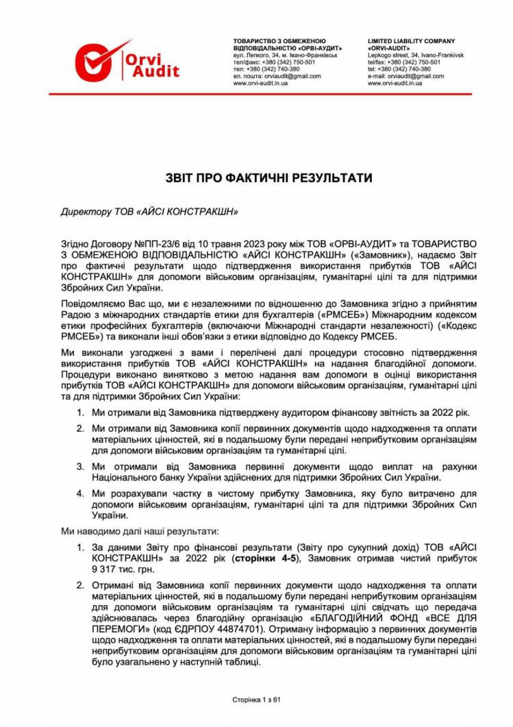 Аудит подтвердил, что согласно финансовой и налоговой отчетности компания IC Construction в 2022 году получила на счет 41 млн 713 тыс. гривен, которые использовались для выполнения заказов гуманитарных фондов из Украины и стран Европы, среди которых – крупнейший благотворительный фонд Эстонии Slava Ukraini и украинский фонд "Все для победы".