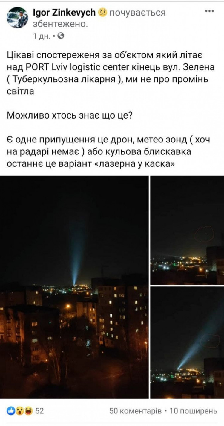 "Цікаві спостереження за об'єктом, який літає над Port Lviv logistic сenter, кінець вулиці Зеленої (туберкульозна лікарня). Ми – не промінь світла. Можливо хтось знає, що це?". Є одне припущення – це дрон, метеозонд (хоча на радарі немає), або кульова блискавка. Останній варіант – це "лазерна каска", – написав Ігор Зінкевич.
